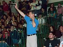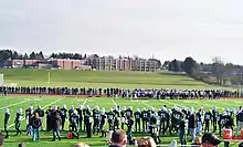 In February 2013, the Enfield Board of Education voted for the Eagle to be the consolidated high school's new mascot. A survey was taken of 1,500 students from Enfield High School, Fermi High School, and John F. Kennedy Middle School as an opinion to influence a final decision to be made by the Board. As a result of the survey, top choices for mascots were the Falcon, Eagle, and Spartan. Top color choices were and blue/gold and black/green/gold, which the school board favored and subsequently adopted.[19] The decision for the Eagle was influenced by the presence of American bald eagles on the property, which occasionally make an appearance during sporting events and school gatherings.[20]