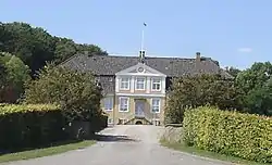The main building is from 1781–85. It is an 11 bay long, one-storey building with Mansard roof and a two-storey, three-bay avant corps on both sides. The building is rendered yellow with white details.[3] A staircase with Rococo railing in the vestibule connects the two floors. The ceiling in the music room features a gilded rosette.
