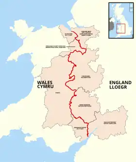 The boundary passes between Flintshire, Wrexham County Borough, Powys, and Monmouthshire in Wales and Cheshire, Shropshire, Herefordshire and Gloucestershire in England.