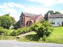 The former chapel and school are built in red brick with ashlar dressings. Both have datestones recording the years of their building. The chapel has a symmetrical gabled entrance front, having a central doorway with a moulded surround and a fanlight. This is flanked by a sash window on each side, with similar windows above. The windows contain 4×4 panes, and have stone sills and wedge lintels. The datestone is in the gable. Attached to the right of the chapel is the school. This is in a single storey, and has a gabled porch. The chapel is approached by a flight of stone steps, and in front of it is a wall surmounted by cast iron railings. On 29 January 1979 the chapel and school were designated as a Grade II listed building.[3][lower-alpha 1]