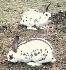 The breed has been common in England since the 1850s, and was imported to North America at around 1910.[2] The American English Spot Rabbit Club was established in 1924. The French named the breed "Lapin Papillon Anglais", or the English Butterfly Rabbit from the butterfly marking on the nose.[3] Previous generations of the breed entailed a white rabbit with patches of color and through the years has acquired clearly defined markings.[2]