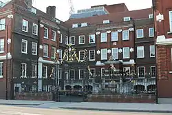 Representations in person of Saints or other figure are very rare, although there are however a few uses, mostly originating from seals, where there have never been such limitations.[3] Although many places have dropped such iconography, the Metropolitan Borough of St Marylebone, London, includes a rendering of the Virgin Mary, although this is never stated.[4] This is also the case in many other examples, particularly those depicting Christ, to remove religious complications. Unlike in mainland Europe where family crests make a large use of their eponymous Saints, these are few and far between in England.