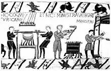 Another marker of the upper classes was an elaborate headdress. These could involve wires, draping fabric and pointed caps. Again, because of the cost the poor could not afford these and instead wore simple cloth veils called wimples that "draped over the head, around the neck and up to the chin".[69] Working women wore ankle length dresses and men wore short tunics and breeches. The longer the garment, the higher in station a person was. This is evident in the sumptuary laws of 1327 which states "coming to the lowest class no serving man is to use 2½ yards in a short gown or 3 in a long one".[70] Also, serving men such as servants or attendants usually did not wear cloaks, and for the nobles who did it served to distinguish them from the masses.[71]