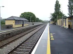The station opened on 16 November 1863.[2] Originally there was a turntable behind the second platform which was used during the building of the tunnel under Enniscorthy town but was also used afterwards due to heavy traffic on Market Day. There was once an engine shed that was opposite of the present-day goods shed. Two water columns were at each end of the platforms and there was also a very long siding for loading cattle. There were also a number of sidings, including a siding for O'Donahoes behind the station building, a siding for Buttles Bacon Factory (which is now the site of the Enniscorthy Swimming Pool), a siding at the entrance of the tunnel for Roches and another siding that went under Barrack Street via a tunnel to Minch Norton.[3] Outside Enniscorthy there were sidings for St. Johns Flour Mill and St. Johns Foundry and a siding at the headshunt for Kavanaghs Cement.[4]