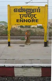 Ennore railway station is one of the railway stations of the Chennai Central–Gummidipoondi section of the Chennai Suburban Railway Network. It serves the neighbourhood of Ennore, a suburb of Chennai, and is located 16 kilometres north of Chennai Central railway station. It has an elevation of 7 metres above sea level.