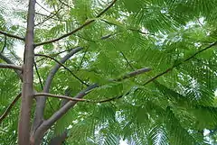 The alternate leaves are bipinnate compound, 15–40 cm long and 17 cm broad with a 2–6 cm petiole bearing 4–15 pairs of pinnae, each pinna with 40–70 leaflets; the leaflets are slender oblong, 8–15 mm long by 2–4 mm wide. Near its base, the twiggy petiole bares a small, raised, oval gland. The leaves are confined to the outer shell of the crown, yet they are plentiful enough to make it moderately dense and green. The guanacaste is evergreen, or briefly deciduous for 1–2 months during the dry season. Most foliage is shed in December, at the start of the dry season. In late February, a growth surge is initiated that re-establishes a fresh, thick crown by April.
