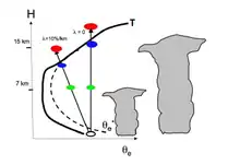 Homogeneous mixing is a model that assumes that the timescale for the mixing within a cloud was short compared to the evaporation timescale. This would imply that the dry, unsaturated, environmental air would be entrained throughout the cloud before it would start to evaporate the cloud droplets. The entrainment mixing that results from this model manifests as a partial evaporation of all the drops within the cloud, but no change in the number of cloud drops.[2][3] A contrasting model of entrainment is inhomogeneous mixing. This model assumes that the time it takes to evaporate cloud drops is short compared to the mixing timescales. Therefore, the saturated air that mixes with the unsaturated environment air would completely evaporate the cloud drops within the entrained area, which would reduce the total number of cloud drops.[2][3]
