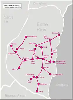 The Entre Ríos Railway (ERR) (in Spanish: Ferrocarril Entre Ríos) was a British-owned railway company that built and operated a 1,435 mm (4 ft 8+1⁄2 in) standard gauge railway network in Entre Ríos Province, between the rivers Uruguay and Paraná, in Argentina.