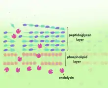 Endolysins are specialized enzymes derived from bacteriophages, viruses that infect bacterial cells in order to replicate within them. Because phages have coevolved with their bacterial hosts, the endolysin system is very efficient at degrading bacterial cell walls.[3] Phages release endolysins from inside bacterial host cells that cleave the peptidoglycan bonds of the bacterial cell wall.[4] Once the cell is lysed, the bacteriophage is able to release progeny virions into the environment which in turn infect more bacterial cells.[5] In addition to degrading bacterial cell walls from within, endolysins are effective when applied externally and can lyse Gram-positive bacteria that lack an outer cell membrane.[6] Enzybiotics utilize endolysins to combat pathogens, exploiting their ability to hone in on specific bacterial cells, their nontoxicity toward eukaryotic cells, and a decreased risk of pathogen resistance because they target highly conserved peptidoglycan bonds.[4] A rapid killing rate of bacteria has also been observed upon administration of endolysins due to the enzymatic mechanism, as have synergistic effects among different endolysins and in combination with antibiotics, improving treatment outcomes of bacterial infections.[3]