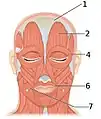 ![]() Muscles of the head, face, and neck. (Epicranial aponeurosis visible at top labeled 1.) | |