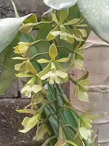 E. coronatum is a sympodial epiphyte that produces slightly thickened stems up to 70 cm long,[1] covered by the basal sheaths of the fleshy, alternate, ovate-lanceolate leaves,[2] which grow up to 10 cm long and 2.5 cm wide.[3] The arching apical racemose inflorescence has small sheaths at its base, and carries many waxy-textured, green to cream colored flowers. The dorsal sepal, at 20 mm long, is slightly longer than the lateral sepals and the petals, which measure 18 mm. The lip is adnate to the column to its apex, and convex beyond the column. Ruiz and Pavon describe the lip as trilobate, with the medial lobe carrying two smaller divisions; Dodson and Vásquez use the term "4-lobed" to include the divergent processes of the medial lobe.