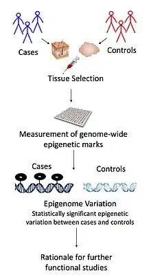 An epigenome-wide association study (EWAS) is an examination of a genome-wide set of quantifiable epigenetic marks, such as DNA methylation, in different individuals to derive associations between epigenetic variation and a particular identifiable phenotype/trait. When patterns change such as DNA methylation at specific loci, discriminating the phenotypically affected cases from control individuals, this is considered an indication that epigenetic perturbation has taken place that is associated, causally or consequentially, with the phenotype.[1]