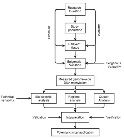 Post-translational histone modifications include, but are not limited to, methylation, acetylation and phosphorylation on the core histone tails. These post-translational modifications are read by proteins that can then modify the chromatin state at that locus.[1] Epigenetic variation arises in three distinct ways; it can be inherited and be therefore present in all cells of the adult including the germline (a process known as transgenerational epigenetic inheritance; a controversial phenomenon that has not yet been observed in humans); it can occur randomly and be present in a subset of cells in the adult, the amount of which depending on how early in development the variation occurs; or it can be induced as a result of behavioural or environmental factors.[1] EWAS has previously associated changes in methylation with several diseases and complex conditions which do not have a known epidemiology and therefore are crucial for the identification of epigenetic factors that contribute to or are a consequence of pathogenesis of these diseases.[3]