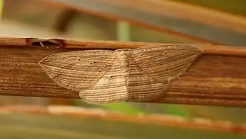 The wingspan of the adult moth is about 40 mm.[8] Adults can be seen from spring to late summer (October to May).[5] E. verriculata have light brown wings with parallel horizontal stripes that resemble the veins in dead cabbage tree leaves; the moth sits with its body perpendicular to the leaf's long axis and wings pressed up against the leaf, its markings lining up with the veins. If disturbed, the will only fly a short distance before finding another dead brown leaf to settle on, avoiding the green fresh leaves.[6] Although attracted to light, the adult moth is inconspicuous when resting by day on cabbage tree leaves, and this camouflage helps protect it from predators.[8]
