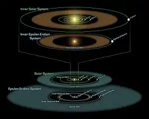 The Epsilon Eridani system also includes two belts of rocky asteroids: at about 3 AU and 20 AU from the star. The orbital structure could be maintained by a hypothetical second planet, which if confirmed would be Epsilon Eridani c.[25] Epsilon Eridani hosts an extensive outer debris disk of remnant planetesimals left over from the system's formation.[26]