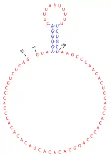 The short W repeat intron, rather than being spliced and rapidly degraded, persists after splicing and is the third most abundant EBV-produced small ncRNA in latency III. Nucleotides 4 to 26 of ebv-sisRNA-1 form a short hairpin loop that presents a Uridine-rich sequence motif (a possible platform for protein interactions) into the loop. The remainder of the sequence is unlikely to form stable RNA structure. This unstructured stretch of sequence may be exposed to allow for interactions with nucleic acids or other proteins. The sisRNA sequence is ~100% conserved in EBV strains and homology extends to include other lymphocryptoviruses. The hairpin structure is also conserved and includes structure-preserving mutations in its stem.[5]