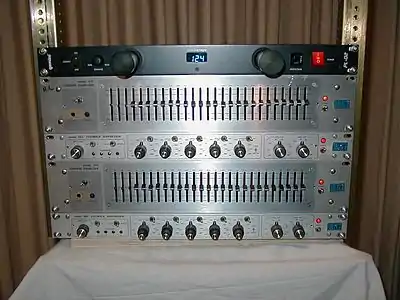 The Langevin Model EQ-251A was the first equalizer to use slide controls. It featured two passive equalization sections, a bass shelving filter, and a pass band filter. Each filter had switchable frequencies and used a 15-position slide switch to adjust cut or boost.[8] The first true graphic equalizer was the type 7080 developed by Art Davis's Cinema Engineering. It featured 6 bands with a boost or cut range of 8 dB. It used a slide switch to adjust each band in 1 dB steps. Davis's second graphic equalizer was the Altec Lansing Model 9062A EQ. In 1967 Davis developed the first 1/3 octave variable notch filter set, the Altec-Lansing "Acousta-Voice" system.[9]