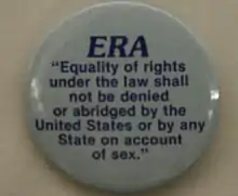 Equity in feminism is a branch of liberal feminism that creates a political stance assuring women's rights within or under the law.[19] The battle for equity becomes political as many argue women and other groups who are considered oppressed are denied the same opportunities of cis-gender white males. Since the rejection of the ERA in 1972, the fight for equity has continued to grow in America and pushed for new laws that would protect women as it would have. Equity in feminism is important because it notes that women deserve the same rights. If there is no political push for a feminist equitable society, it would create a statement that women are lesser than men and don't deserve the same treatment regardless of education or social class.