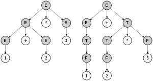 For the example string "1+2*3", the right part of the picture shows its unique parse tree with the second grammar;[note 2] evaluating this tree in postfix order will yield the proper value, 7. In contrast, the left picture part shows one of the parse trees for that string with the first grammar; evaluating it in postfix order will yield 9.