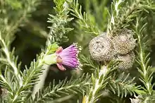 The flowers are pink to deep pink and are borne usually in pairs on the ends of the branches. They have 5 sepals which are often hairy on the outside surface and 5 petals, 4.2–4.5 millimetres (0.17–0.18 in) long. The stamens, which give the flower its colour are arranged in 5 bundles, each containing 14 to 33 stamens. Flowering occurs from December to January and is followed by fruits which are woody capsules which are 5.4–6.5 millimetres (0.2–0.3 in) long.[2]