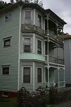 The Eric Carlson Three-Decker is located in Worcester's eastern Belmont Hill neighborhood, on the west side of Eastern Avenue south of Catharine Street. It is a three-story wood-frame structure, with a hip roof and clapboarded exterior. It has an extended cornice with brackets, as well as fish-scale shingling on skirt sections between floors. Some windows have caps with a sawtooth finish. Its main facade is divided into two sections: the left side has a projecting polygonal window bay, while the right side has a stack of three porches. The porch entrances are near the center, with small square fixed windows to their right. The porch features spindled balustrades and turned posts, with brackets at the tops.[2]