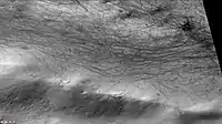 The Eridania quadrangle is the location of gullies that may be due to recent flowing water. Gullies occur on steep slopes, especially on the walls of craters. Gullies are believed to be relatively young because they have few, if any craters. Moreover, they lie on top of sand dunes which themselves are considered to be quite young. Usually, each gully has an alcove, channel, and apron. Some studies have found that gullies occur on slopes that face all directions,[3] others have found that the greater number of gullies are found on poleward facing slopes, especially from 30-44 S.[4][5]