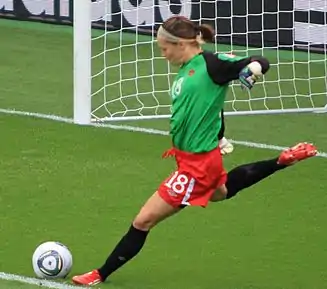 Erin Katrina McLeod (born February 26, 1983) is a Canadian soccer player who plays as a goalkeeper for the National Women's Soccer League club Orlando Pride and the Canadian national team. She first appeared for the Canada women's national soccer team at the 2002 Algarve Cup and has since made 118 appearances for the team. In 2012, as part of the Canadian Soccer Association's Centennial Celebration, she was honoured on the All-Time Canada XI women's team.[2]