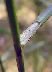 In the wild, Eriophorum angustifolium is a creeping rhizomatous perennial sedge,[3] with an abundance of unbranched, translucent pink roots.[4] Fully grown, it has a tall, erect stem shaped like a narrow cylinder or triangular prism; it is smooth in texture and green in colour. Reports of the plant's height vary; estimates include up to 60 cm (24 in),[5] 15–75 cm (5.9–29.5 in),[6] and up to 100 cm (39 in).[2] E. angustifolium has "stiff grass-like foliage" consisting of long, narrow solidly dark green leaves, which have a single central groove, and narrow from their 2–6-millimetre (0.08–0.24 in) wide base to a triangular tip.[3][7] Up to seven green and brown aerial peduncles and chaffs, roughly 4–10 millimetres (0.16–0.39 in) in size, protrude from umbels at the top of the stem from which achenes are produced after fertilisation, each with a single pappus; these combine to form a distinctive white perianth around 5 centimetres (2.0 in) long.[3][8]