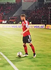 He made his debut for Albania on 15 November 2013 in a friendly match, the first one after the end of the qualification campaign against Belarus playing the full 90 minutes match, which finished in a 0–0 draw.[31][32] He received another call up for the next friendly match on 5 March 2014 against Malta.[33]