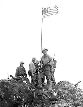 ![]() Platoon Sergeant Ernest Thomas (foreground, facing front) after he helped raise the flag on Mount Suribachi | |