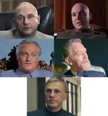 Blofeld's appearance changes according to the personifying actor and the production.[15] He has a full head of black hair in From Russia With Love and Thunderball; a bald head and a facial dueling scar in You Only Live Twice; a bald head with no scar or earlobes in On Her Majesty's Secret Service; and silver-grey hair in Diamonds Are Forever. This metamorphosing matches Fleming's literary portrayal of a master criminal who will go to great lengths to preserve his anonymity, including the use of plastic surgery.[15] He often wears a jacket without lapels, based loosely either on the Nehru jacket or on the Mao suit, a feature which is used in spoofs like the Austin Powers series, though in his early two appearances on film he wears a black business suit.