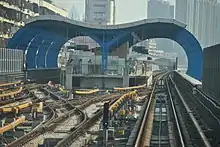 Erqi Road (Chinese: 二七路; pinyin: Èrqī Lù) is a station on Line 1 of Wuhan Metro, opened upon the completion of Line 1 (Phase 2) on July 29, 2010.[1] It is an elevated station situated at the intersection of Jiefang Avenue and Erqi Road. The station has one island platform and two siding tracks to the north of the station, connected by a pair of crossover tracks, accommodating trains entering and exiting services during peak hours.