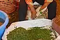 A woman slicing Eru leaves