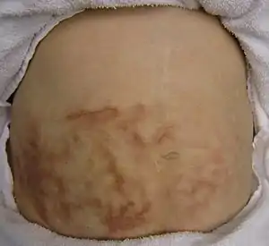 Erythema ab igne (EAI), also known as hot water bottle rash,[2] is a skin condition caused by long-term exposure to heat (infrared radiation).[3] Prolonged thermal radiation exposure to the skin can lead to the development of reticulated erythema, hyperpigmentation, scaling and telangiectasias in the affected area. Some people may complain of mild itchiness and a burning sensation, but often, unless a change in pigmentation is seen, it can go unnoticed.