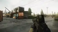 The developers of Escape from Tarkov refer to the game as a realistic and hardcore first-person shooter, survival video game that borrows elements from massively multiplayer online games.[3][4] In its current state, Escape from Tarkov incorporates several modes for the players to play: online PMC raids, Scav (short for "scavenger") raids,[5][4][6] and a temporary offline mode.[3] In these raids, players can choose to play solo or in groups and spawn on one side of a variety of maps to choose from in the game.[7] Once in-game, the players are given an extraction point on the other side of the map, and must fight against other players and non-player characters to reach that point in order to escape. In addition to these standard extractions, players are also given the opportunity to use "optional" extraction points near the middle of the map, but in order to do so you must meet various requirements per extract such as paying roubles (the primary in-game currency), not having a backpack, or having certain items equipped on their character.[8] In addition to combat, players can also find loot in these maps such as firearms, equipment, and armor, and once extracted, can store their loot in a stash to use in future raids or can be sold to other players in a virtual flea market if having a "found in raid" status.[8][9]