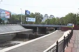 The length of the river is about 43 km which nearly divides the city in half. In the city of Almaty, the banks and river beds are concreted in the form of the thresholds. In the Zhetysu district of the city, between the streets of Pavlodar and North Ring, the canal of the river is completely covered. It comes back to the surface in the area of the village Pervomaika where the river divides into branches and channels that are used for irrigation, while the remaining water ends up in the sewers. The main channel of the river turns right, and then joins the river Karasu-Turksib, which flows directly into the Small Almaty River.