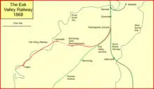 From 1860 local promoters negotiated with the North British Railway (NBR; the NBR was working the Peebles Railway) over the construction of a branch line to Polton from the Peebles line. At this time there was intense rivalry between the NBR and the Caledonian Railway, especially over retaining a monopoly of service in any geographical area while attempting to penetrate the rival's area. The NBR were quick to act in support of the line to Polton, fearing that the Caledonian would enter the district otherwise; indeed the Caledonian had published proposals to build a line into the area, from Slateford via Penicuik to Dalkeith.[1][2] The NBR paid the Parliamentary deposit for the Bill to be presented.[1] The Polton branch line became the Esk Valley Railway, and was authorised by Act of Parliament of 21 July 1863.[2][3][4][5] It was to be two miles in length.