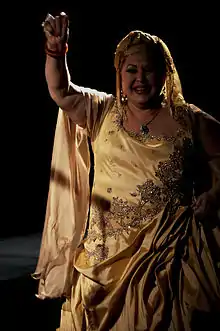 Redžepova was particularly noted for her powerful and emotional voice. In 2010, she was cited among the 50 Great Voices in the world by NPR.[4] Redžepova was also noted for her extravagant attires and her turbans, as well as the use she made of typical stereotypes about Romani women, such as sensuality and happiness. In 2010, she was awarded the Macedonian Order of Merit; and in 2013, she was named National Artist of the Republic of Macedonia by President of Macedonia Gjorge Ivanov.[5]