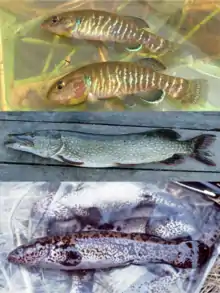 Despite differing size and mouth shape, all extant species of esocids are sight-based ambush predators taking any animal they can fit in their mouth. Both pike and blackfishes display cannibalistic tendencies.[2][3] While the Olympic mudminnow is aggressively territorial to fish of the same size during the spawning season, it will generally leave its fry alone.[4]