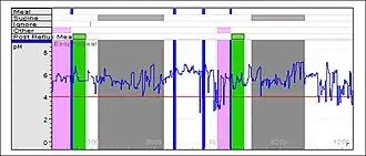 A reflux episode is defined as esophageal pH drop below four. Esophageal pH monitoring is performed for 24 or 48 hours and at the end of recording, a patient's tracing is analyzed and the results are expressed using six standard components. Of these 6 parameters a pH score called Composite pH Score or DeMeester Score has been calculated, which is a global measure of esophageal acid exposure. A Demeester score > 14.72 indicates reflux.[7]