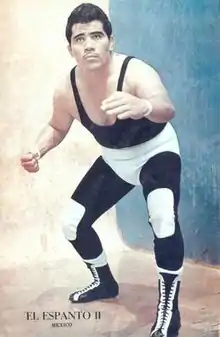 The Los Espantos trio got their biggest win when they defeated the "dream team" of Mexican tecnicos El Santo, Blue Demon and Mil Máscaras, sparking a long-running rivalry between the two trios.[2] During that time period Los Espantos also formed a team with El Gladiador, often facing El Santo and various partners. One particularly heated match saw Los Espantos and El Gladiador fight their opponents, Ray Mendoza, René Guajardo, and Karloff Lagarde all the way back to the locker rooms in an era where such a thing was unheard of in Mexico.[2] In June 1964 Blue Demon defeated Espanto II in a Lucha de Apuestas match, leaving him bald as a result.[8] The following year Espanto II lost his hair to Blue Demon's long time tag team partner, Black Shadow.[4] In 1966 Espanto I and II won the Mexican National Tag Team Championship from El Santo and Mil Máscaras, but would later lose the belts to El Santo and Mil Máscaras in a rematch.[4][9]