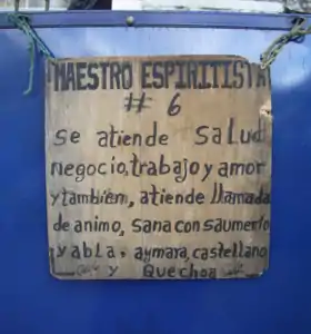 The main focus for this particular branch of Espiritismo is healing. The ranking of the mediums that are required in the rituals is rather simple. Their achievements to solve problems and heal people will allow them to have a higher ranking.[13] There is no clergy found within Espiritismo de Cordon. The Head Medium is generally in charge of the ritual space, but does not always participate in the ritual chain itself.[13] Instead, the Head Medium acts as the guide during the actual ritual. The altar, which is used in Espiritismo de Cordon, takes up a rather large area. The space is usually purified to drive out any evil spirits and welcome good spirits. The entrance is protected by a large bowl of water and all who enter must wash their hands to prevent the spread of evil spirits.[11] Espiritismo de Cordon is different from other religions in the sense that it does not have a set doctrine of beliefs. The religion is open to everyone and does not require new participants to partake in an initiation process.[13]
