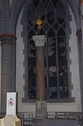 The oldest surviving fitting in the Minster is the column in the choir, which now supports a modern crucifix. Until the fifteenth century it supported a cross coated with a gilt copper sheet, from which the donation plate and probably other remains in the Cathedral treasury were made. The Latin inscription ISTAM CRUCEM (I)DA ABBATISSA FIERI IUSSIT (Abbess Ida ordered this cross to be made) allows the creator to be identified with the Essen Abbess Ida, who died in 971, though the sister of Abbess Theophanu, Ida, Abbess of St. Maria im Kapitol in Cologne has also been suggested. The column itself is probably ancient spolia, going by fluted pedestal and the Attic basis of the column. The capital was carved in antiquity, though exceptionally richly carved for that period. Stylistically it is related to the capitals of the west end and the crypt, as well as those of the Ludgeridan crypt of Werden Abbey and those of St Lucius' Church in Essen-Werden.