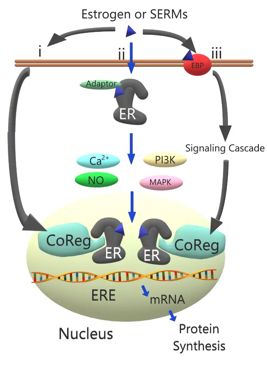 The schematic below models the activity pathway of the estrogen receptor. In the typical estrogen pathway (i) estrogen or other selective estrogen receptor modulators (SERMs) are bound to the estrogen receptor (ER) via the coregulatory proteins (CoReg) in the nucleus. [5] Alternately, the estrogen or SERM complexes may occur through the ER located adjacent to the plasma membrane (ii) with the help of adaptor proteins such as caveolin 1 or SHC1, which target the ER complexes to the plasma membrane.[5] Activation of the ER complex causes increased kinase activity in phosphoinositide 3-kinases (PI3K) and mitogen-activated protein kinase (MAPK) as well as increases in concentrations of signaling molecules like calcium and nitric oxide.[5]