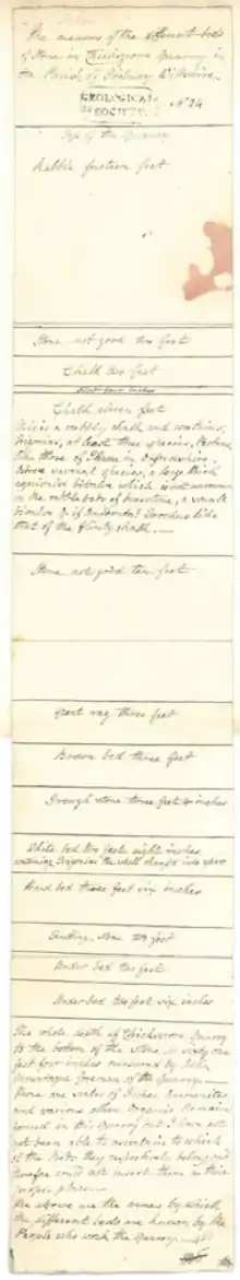 As expected from women at the time, Benett was mainly self-taught in the field of geology. Her financial independence[2] allowed for her to commission an in-depth look at a stratigraphic section of the Upper Chicksgrove quarry near Tisbury in 1819, drawn to scale, but unfortunately there is no scale indicated on the drawing. However, this commission later goes on to be the first bed-to-bed section of the Upper Chicksgrove quarry, certain stones and fossils are still being extracted from the site today, especially those of plants and reptiles.[13] She called this "the measure of different beds of stone in Chicksgrove Quarry in the Parish of Tisbury". However, the stratigraphic section was published by naturalist James Sowerby without her knowledge. Later, she contradicted some of the Sowerby's conclusions based on her own research.