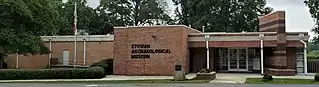 The Etowah Indian Mounds museum displays artifacts found at the site, including Mississippian culture pottery, monolithic stone axes, Mississippian stone statuary, copper jewelry, shell gorgets, and other artifacts.