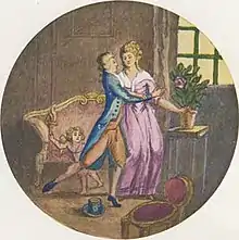 Etta Lubina Johanna d'Aelders[3] was born into a middle-class family in Groningen in April 1743. She was the daughter of Jacob Aelders van Nieuwenhuys, a wallpaper merchant and pawnbroker, and his second wife Agatha Petronella de Sitter. Aelders's father died in 1749 when she was only six years old. Her mother took over the family's business as manager of the pawnshop, a move which was protested by her family, the de Sitters, who did not believe it to be an appropriate occupation as her late husband Jacob had been of a lower social standing than her. The business is recorded to have not been particularly successful, with speculation that widespread anti-semitism resulted in discrimination against d'Aelders's mother due to her Jewish business partner.[4] Despite this, d'Aelders's mother provided a good education for d'Aelders, allowing her to study French and also possibly some English and Italian. This education was remarkable for a girl from a non-aristocratic family at the time.