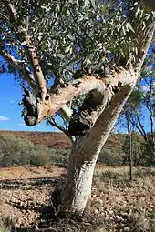 Eucalyptus camaldulensis, commonly known as the river red gum,[3] is a tree that is endemic to Australia. It has smooth white or cream-coloured bark, lance-shaped or curved adult leaves, flower buds in groups of seven or nine, white flowers and hemispherical fruit with the valves extending beyond the rim. A familiar and iconic tree, it is seen along many watercourses across inland Australia, providing shade in the extreme temperatures of central Australia.