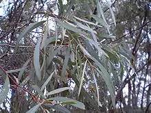 Eucalyptus polybractea, commonly known as the blue-leaved mallee or simply blue mallee,[2] is a species of mallee that is endemic to south-eastern Australia. It has rough, fibrous or flaky bark on the lower part of the trunk, smooth greyish or brownish bark above, lance-shaped adult leaves, flower buds in groups of between seven and eleven, white flowers and cup-shaped or barrel-shaped fruit.