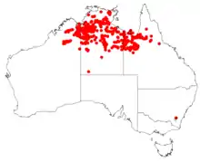 Silver box is found in open savannah woodland communities on low limestone hills and on low-lying flats and grows best in sandy soils. It is widely distributed across northern Australia from the Kimberley region of Western Australia to north-western Queensland. In the Kimberley region of Western Australia it is found to the east of the King Leopold Ranges in the Shire of Halls Creek and Shire of Wyndham-East Kimberley. In the Northern Territory, it is found in the from Katharine to about Tennant Creek, including the Victoria Daly and Roper Gulf Regions and Arnhem Land. In Queenland it occurs as far east as Forsayth and Einasleigh and as far south as Dajarra.[4][8]